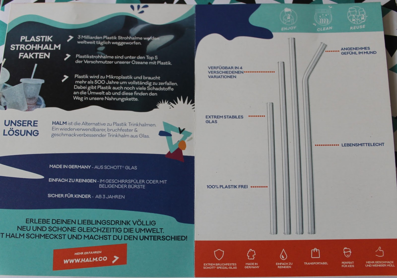 Ein nachhaltiger Trinkhalm aus Glas, der geschmackneutral ist. Eine coole Idee, aber ich hätte gerne zwei gehabt ;) Ganz allein cool zu sein, macht nur halb so viel Spaß! So für Zuhause finde ich ihn auch cool, bei Partys oder so, aber zum Mitnehmen hätte ich eher Angst, dass er kaputt geht.